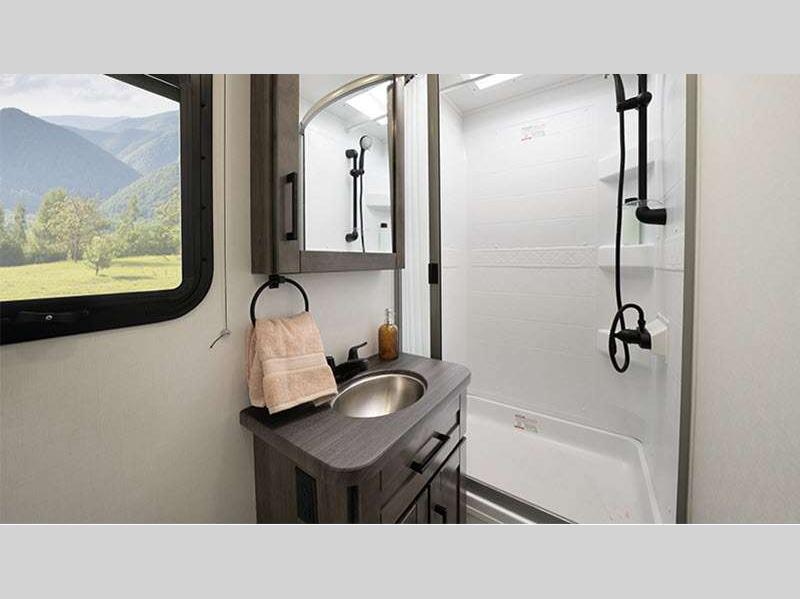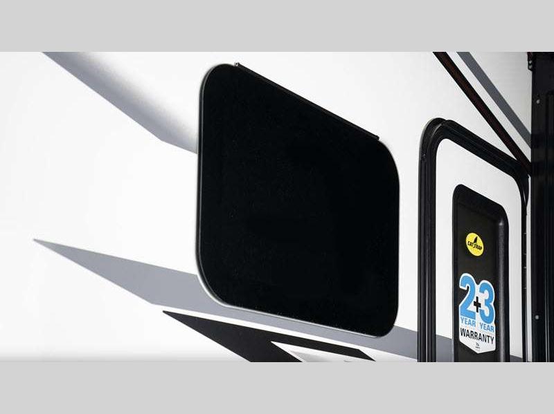 Each is built with a Stronghold VBL™ roof, floor, and sidewalls creating the lightest, yet strongest construction, and a one-piece, seamless fiberglass front cap that resists damage from moisture and debris. There are also aluminum running boards for easy entry into the cab and the main entrance which includes the industry's largest travel-view window and electric-powered step with an integrated house battery compartment. The interior offers seatbelts in all designed seating locations to protect your loved ones, hardwood cabinet doors and drawers for style and durability, high-intensity recessed LED ceiling lights and LED-lit slideout fascia, plus an interior command center and pleated blackout shades for privacy.